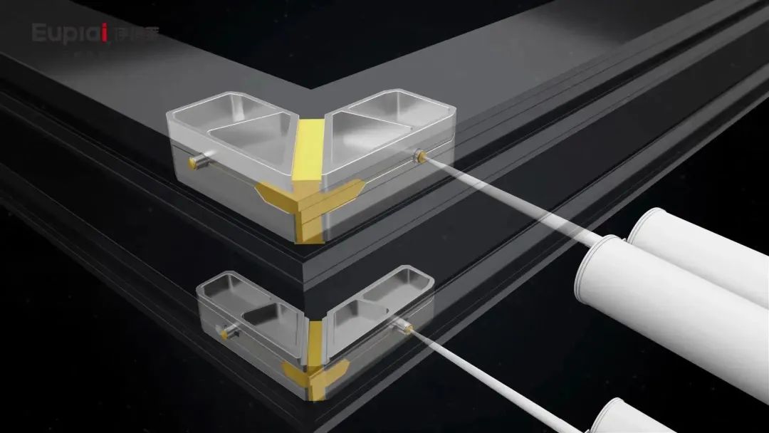 伊博莱门窗组角采用注胶工艺,在塞入角码后注入专用的组角胶,干固后牢牢粘合组角两边的结构,防止运输和日后使用中的松动,避免了产生安全风险。