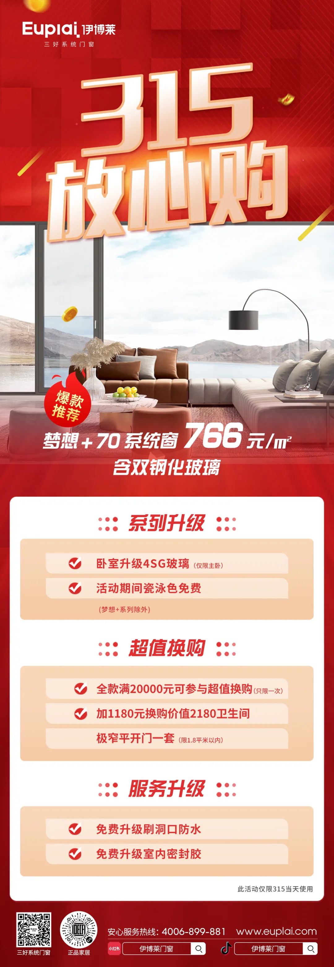 活动期间,伊博莱“315放心购”诚意推出系列升级、超值换购、服务升级等多重重磅福利回馈新老客户,敬请锁定伊博莱门窗全国各大专卖店,更多福利可进店详询。