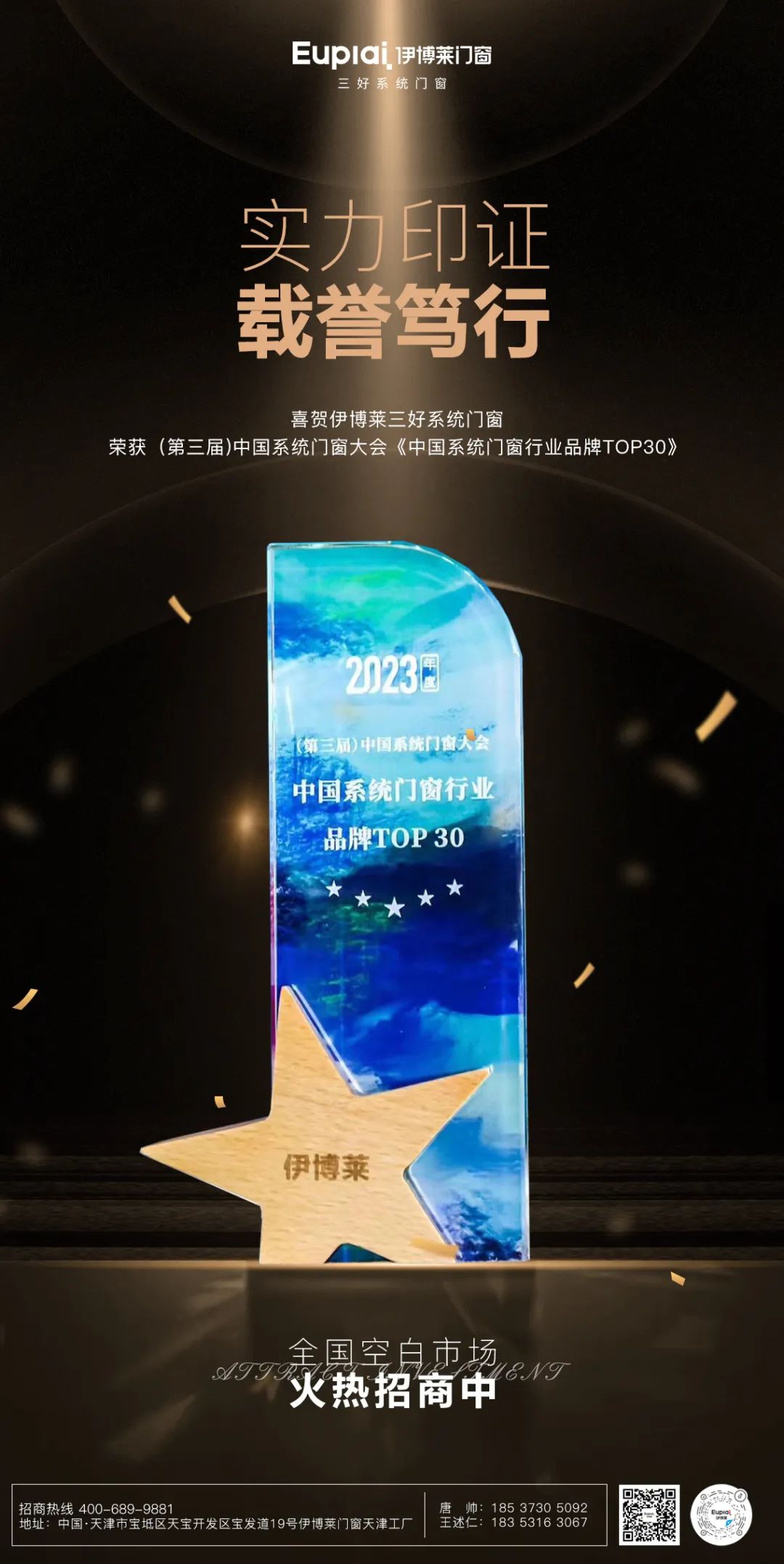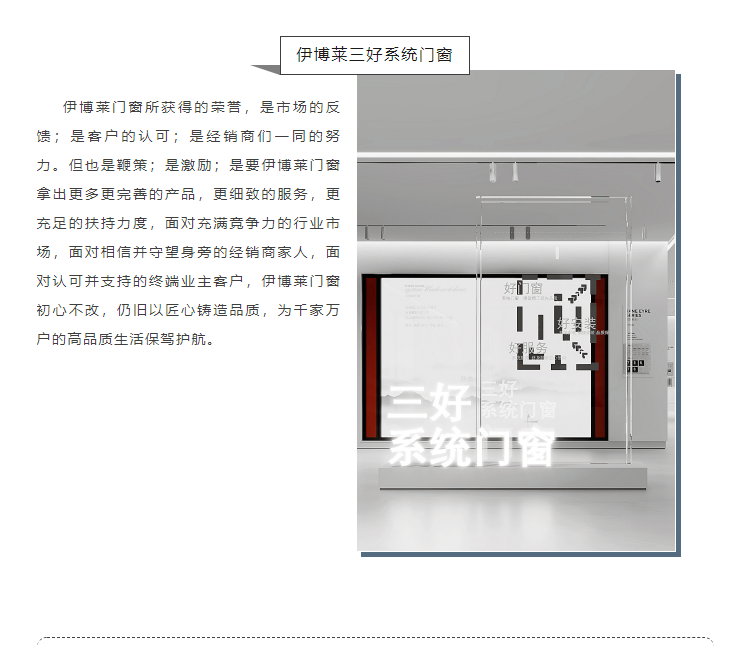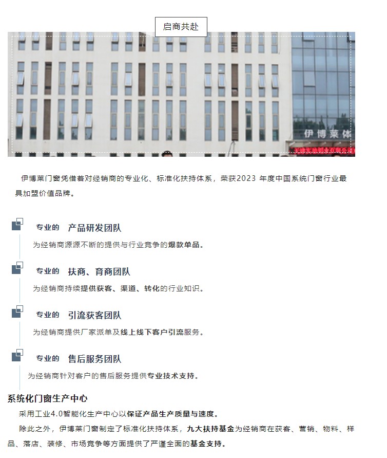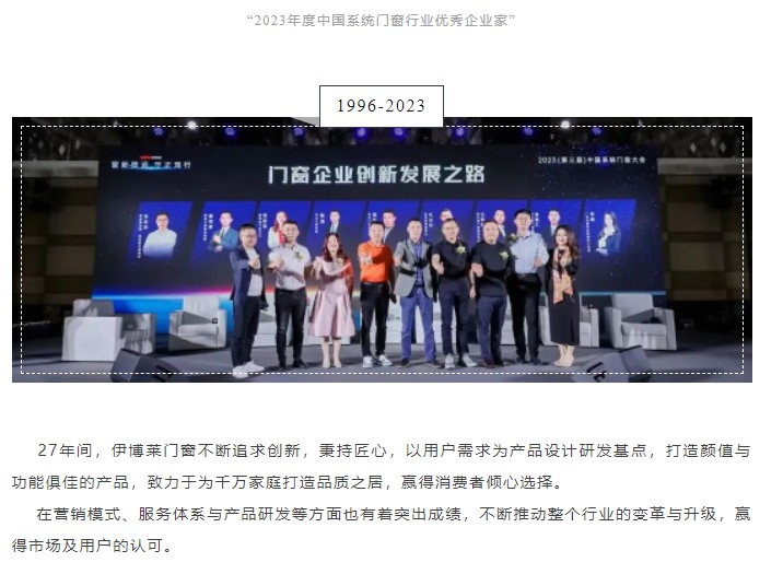 实至名归丨伊博莱门窗荣获(第三届)中国系统门窗大会三项实力大奖!7月5日,由红星美凯龙、优居研究院、中国建博会联合主办的2023(第三届)中国系统门窗大会圆满落幕。在本届峰会中,伊博莱门窗凭借品牌影响力及产品创新优势, 斩获:“2023 年度中国系统门窗行业品牌 TOP 30”“2023 年度中国系统门窗行业***加盟价值品牌 ” 同时,伊博莱三好系统门窗CEO范贵萍女士,凭借***的领导力,荣获: